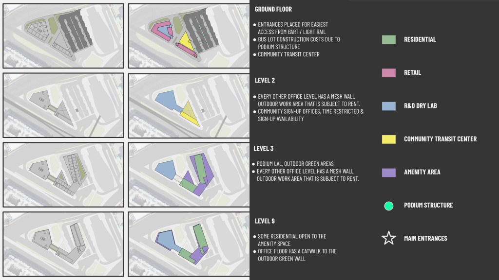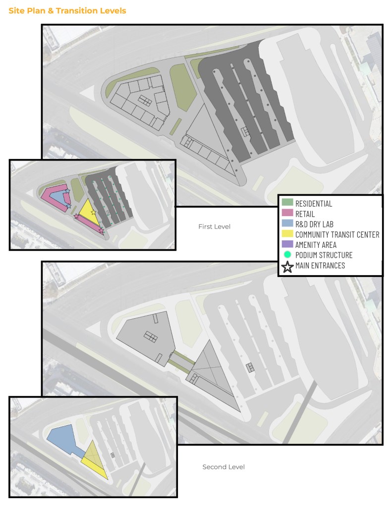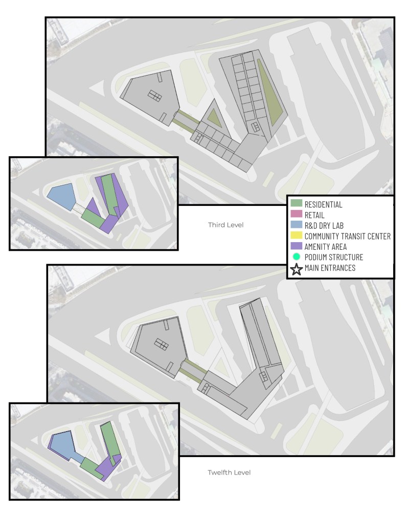 This project is a mixed-use building that incorporates Residential, Retail, R&D Dry Lab Offices, and a Community Transit Center. It is providing a plethora of community engagement features that will be a good fit for the neighborhood. The Bus Transit Center is a place for the community as well as engagement from outsiders to take advantage of the multiple activities that will take place. It is an area next to the courtyard with a green roof that could be opened up and used for city meetings and events, as well as many forms of revenue activity through local artists and groups that would be able to provide shows, arts & crafts, and get togethers.