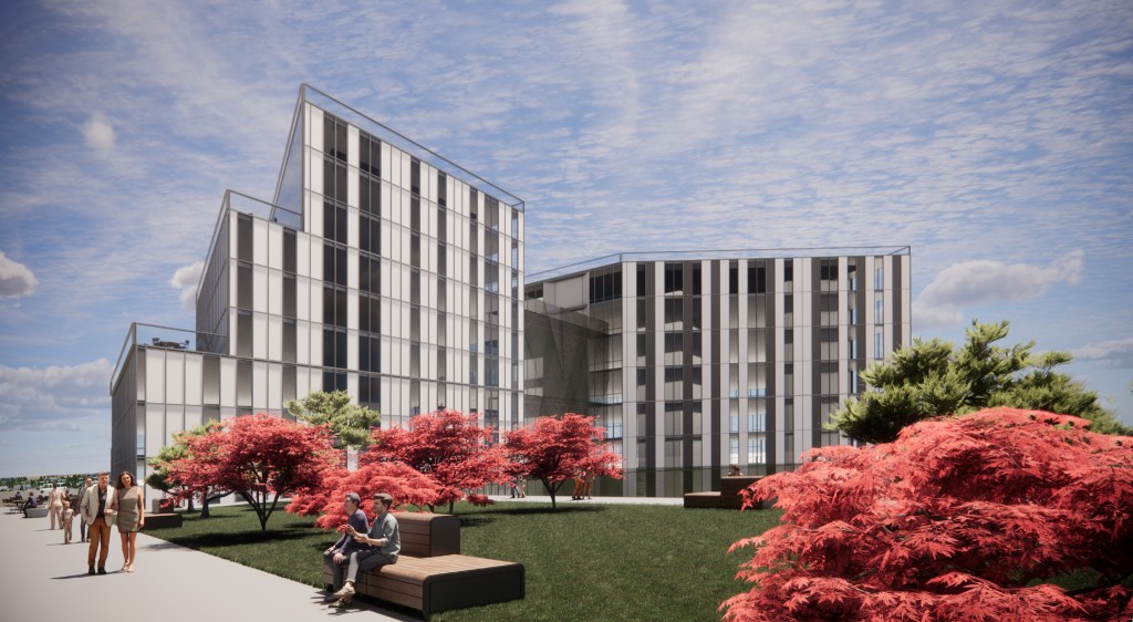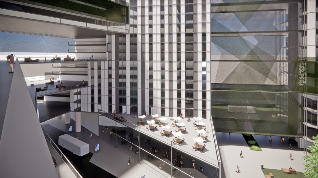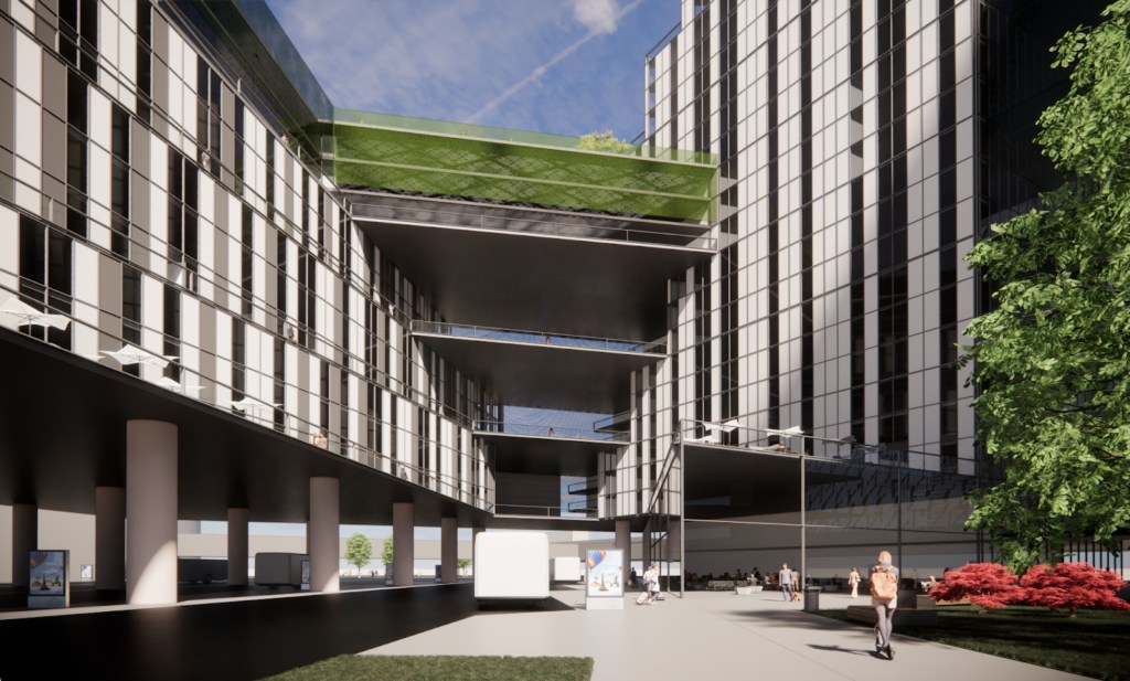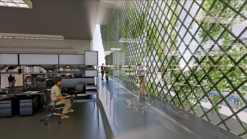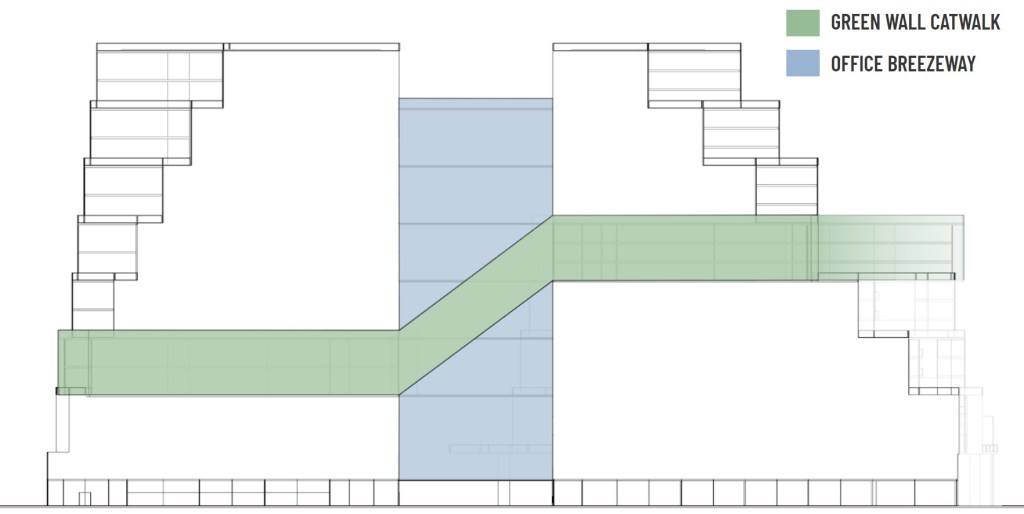 The design implemented the need for large green roofs, a courtyard, and outdoor activities throughout the building. This idea also brought on the need for a green wall and a catwalk around the buildings to enjoy the wall and outdoor space. Furthermore, to add this idea to an office setting, a transition area was created to provide a rentable outdoor breezeway for outdoor workspace. This outdoor work area on multiple levels creates a better work performance from employees for their comfort and health well being. These types of spaces have been proven beneficial to overall work performance.