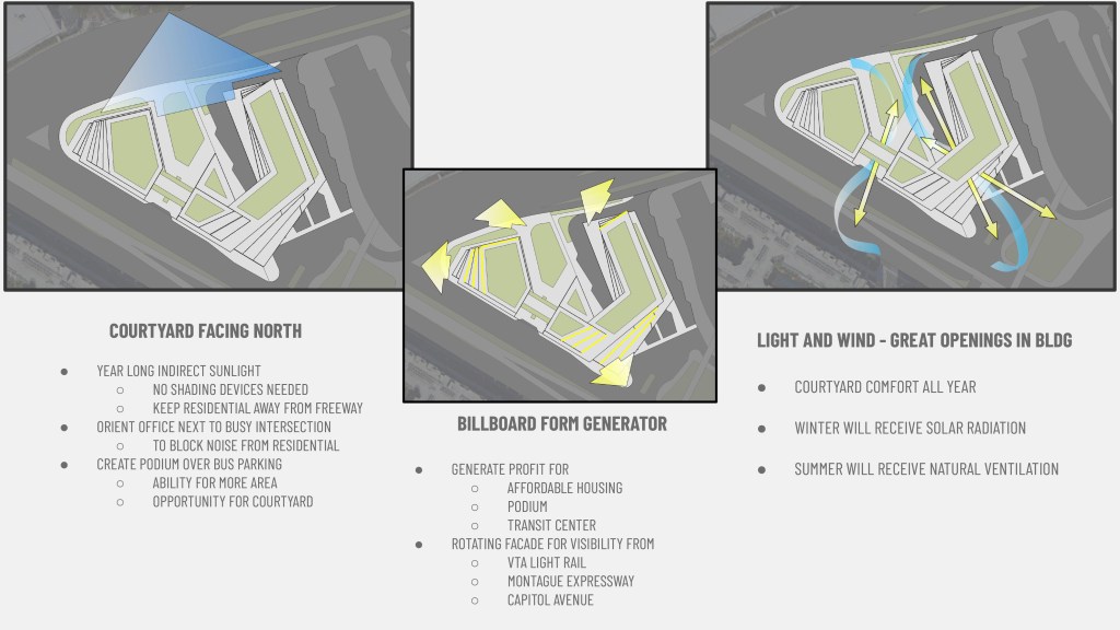 The project opens to the north to receive year long indirect sunlight, to orient the office next to the busy intersection, and to create a podium over the bus parking area that can open to the courtyard. This keeps the residential areas away from the freeway, it blocks the noise levels from the residential program, creates the ability for more building area with the podium, and creates an opportunity to have a courtyard. Another design feature was the introduction of digital billboard space on the building itself. This generates rotations on the building according to viewing angles from the VTA light rail, Montague Expressway, and Capitol Avenue.
